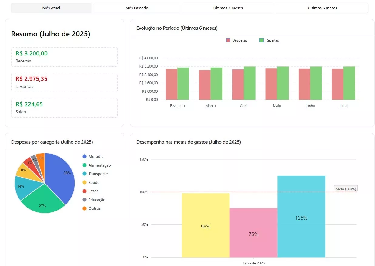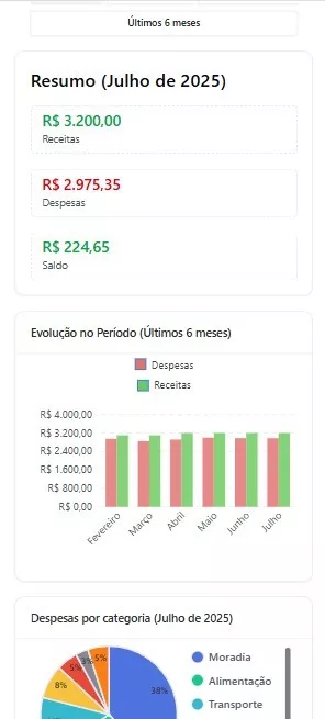 - Relatórios mensais, categorias automáticas e insights